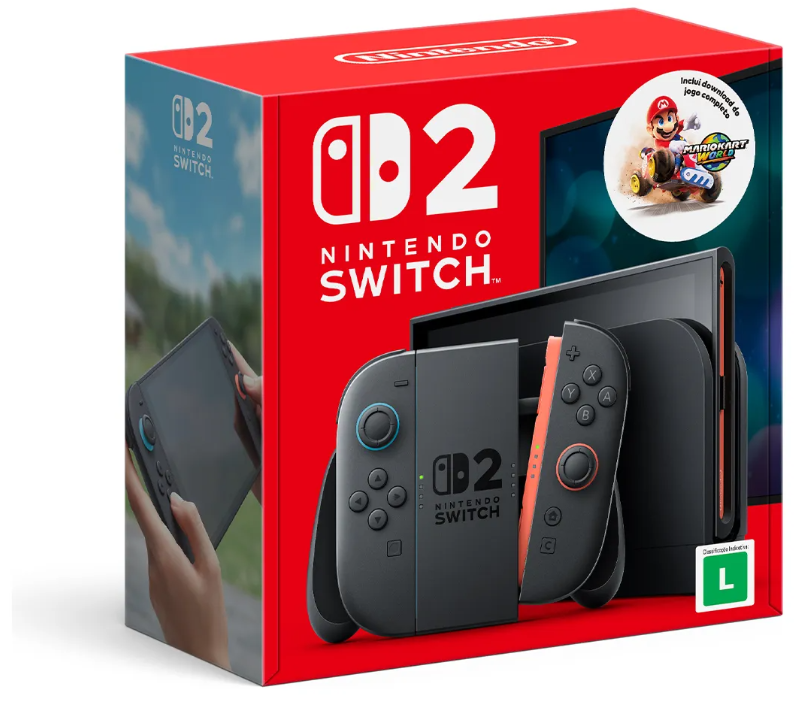 ELEVE A SUA EXPERIÊNCIA DE JOGO COM O NINTENDO SWITCH 2! O console portátil e versátil que combina poder, portabilidade e diversão para toda a família. Com uma tela LCD de 7,9 polegadas em Full HD 1080p, o Switch 2 oferece gráficos nítidos e vibrantes, além de uma taxa de atualização de até 120Hz para jogos mais fluidos e responsivos. Este bundle especial inclui o jogo digital Mario Kart World, a mais nova edição da clássica franquia de corrida que conquista jogadores de todas as idades. Corra em pistas emocionantes ao redor do mundo, use itens estratégicos e desafie seus amigos em multiplayer local ou online. ————————– Principais características do Nintendo Switch 2: Tela LCD de 7,9” com resolução Full HD 1080p e HDR10 para imagens mais vivas e detalhadas. Processador atualizado para maior desempenho e carregamento rápido dos jogos. Suporte a taxa de atualização variável (VRR) até 120Hz, garantindo jogabilidade suave. Sistema híbrido que permite jogar em modo portátil, tabletop ou conectado à TV via dock. Até 4 portas USB para acessórios, incluindo duas no dock e duas USB-C no console. Compatibilidade com a ampla biblioteca de jogos Nintendo Switch. Sobre o Jogo Digital Mario Kart World: Corridas emocionantes em pistas inspiradas em lugares reais do mundo. Personagens clássicos e novos, com veículos customizáveis. Multiplayer local e online para diversão com amigos e jogadores do mundo todo. Atualizações e eventos regulares que mantêm a jogabilidade sempre fresca. Este bundle é perfeito para quem busca um console potente, uma tela maior e a diversão garantida de Mario Kart, tudo pronto para jogar assim que ligar! Aviso legal • A duração da bateria depende do uso que se dê ao produto.
